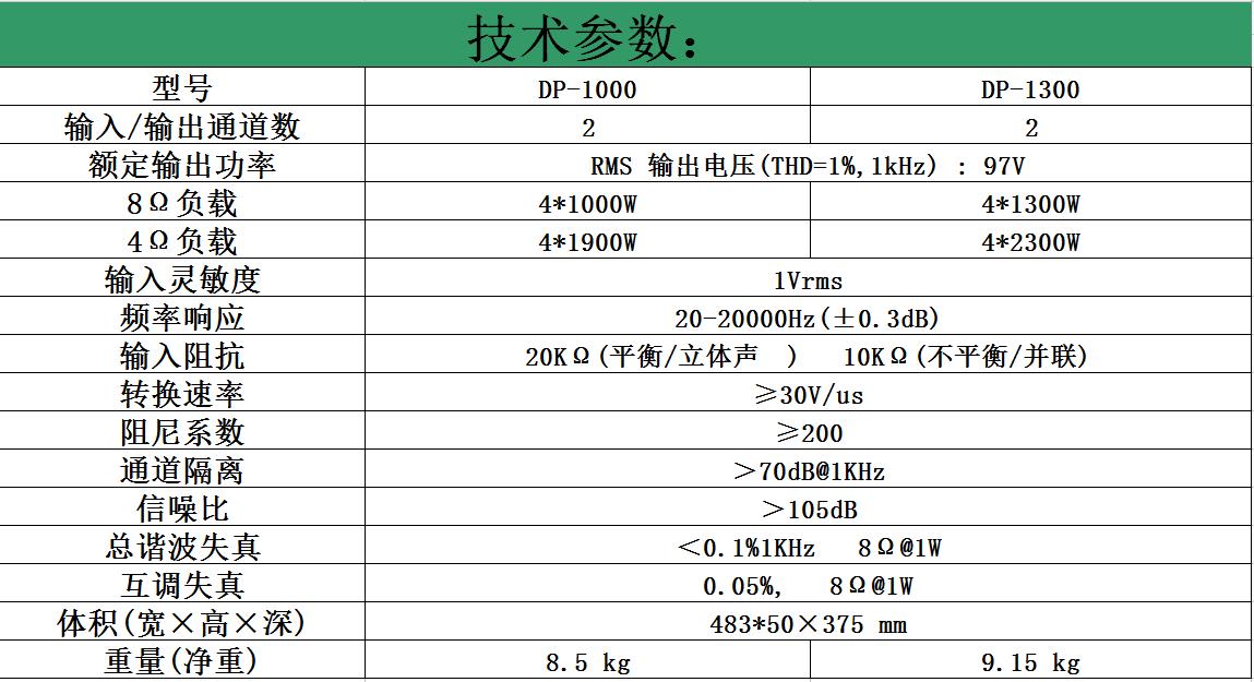 DP系列功放特點(diǎn) 靜噪低:DP系列的數(shù)字功放,前級(jí)輸入噪聲微秒級(jí)關(guān)斷,靜態(tài)無噪聲干擾。音樂流暢, 使用安靜舒適。 效率高:重新設(shè)計(jì)了數(shù)字調(diào)制電路,使其具備輸入動(dòng)態(tài)范圍大、整機(jī)效率高,輸出失真小, 整機(jī)D類高效率達(dá)輸出,低溫工作、節(jié)能省電、低碳環(huán)保。 軟保護(hù):低阻、過熱工作,不斷輸出,盡情娛樂。性能穩(wěn)定,運(yùn)行可靠。 體積�。�1U機(jī)身,深度短,節(jié)省放置空間。 結(jié)構(gòu)美:內(nèi)部設(shè)計(jì)合理大氣,制作精細(xì)。鋁制面板,高檔美觀。